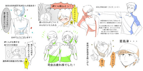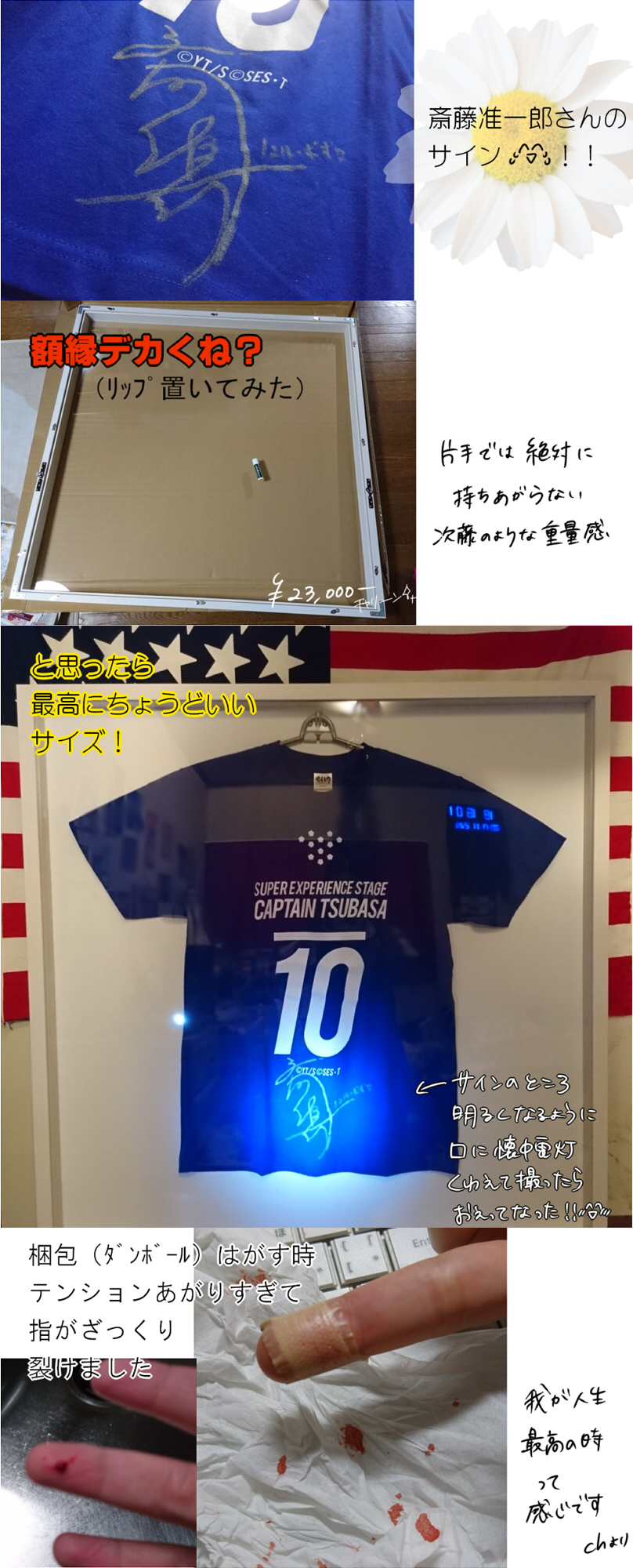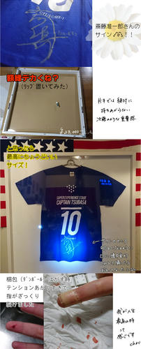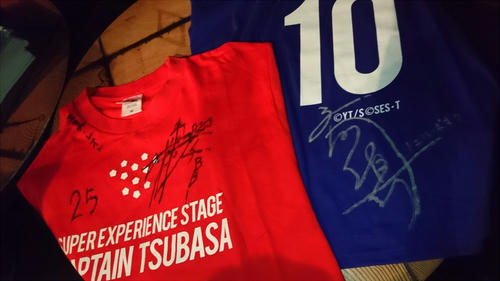 2017/11/04 Category : 絵 翼舞台のファン感謝祭 10/30、8~9月に上演されていた翼舞台のファン感謝祭に行きました!そんときのレポたち 記憶がちがってたらすみません_(┐「ε:)_昼も夜もバラバラです流れ的には挨拶→キャストさんたちの好きなシーンを見よう→クイズ大会みたいなの→大抽選会→ハイタッチで見送り を主にやって、昼夜でちょいちょいちがうことをやりました以下、覚えてる場面で好きなところをいくつか箇条書き(自分用メモ)*かねがえさんがお菓子ばっかり食べてるので「こうきはお菓子食べないの?」→「あんま食べないっすね」で次の瞬間バスケットを抱えてお菓子食うこうきさんが映る→会場爆笑で散々いじられる 映像さんがすごく仕事をしていた*サルバディの謎の生き物の中にはAKIさんやえびけんさんが居たらしい! AKIさんのお尻が頭 「…エェイ」(鳴き声)*クイズ大会は簡単なものから、テイクアウトライブからのコアな出題まで正解者にはサイングッズなどがもらえる 超豪華*ロベルト役の田中さんがオシャレ眼鏡のせいでまったく顔がわからない*シュナイダーが輝く度すげえアピッてくる北村さん*シーンによっては全日本の輪に入れず仲間外れをアピッてくる中村さん(源三)*当日いないのにことごとくコケにされる若島津「キエッ・・・!」*千秋楽で感極まってしまう元木さん「聖也すぐ泣く」って言われてたそれよりも泣いてたらしい廣野クン そして元木さんにつられて感極まって台詞が裏返ってしまったのを散々笑われるかねがえさん*石崎のSGGKは公演ごとにちがって23種類ある(すごい!)ネタ切れの時は松山くんに力を借りたらしい さすがモテ男*ストロボのシーンなどシーンのいくつかはキャストさんも初めて見たらしい「こうなってたの!?」「練習の時なにやってんのかと思ってたwww」*かねがえさんがゴールポストに(練習時)上れないこともあったらしい本番では全部のぼったらしい プロ根性を感じる*抽選会でむにたんが源三サインシャツ、ナガサワさんが松永さんサインシャツを当て、ナガサワさんはううわんさんに譲っていた・・・!白衣の天使・・・そして私は斉藤さんサインシャツを後ろの席の御姉様に譲っていただき・・・お優しいお方でした・・・本当にありがとうございます・・・一生忘れません!!!でかすぎる額縁に飾って部屋の中で大切にしています!(以下嬉しさのあまりついったに乗せた奴 血液注意)*ハイタッチ会はハイテンションになってしまいあまり覚えてない・・・けどキャストの皆様がみなさん笑顔で目まで合わせてくださって、無事死亡という感じですさらに昼の時に斎藤さんとハイタッチ(この文だけで倒れそう)する際凄い勢いで「好きです!!!!!!!!!!!!!!!!!!!!!!!」と言ってしまい、お礼の御言葉を頂戴しましたが、多分引かれたと思います中村さんは手をちょっと握ってくれました!惚れる!!夜は夜で斎藤さんに「サインシャツ大事にします!!!!!!!!!!!!!」ってうるさい感じになり、更に松永さんがすごい笑顔でタッチしてくださったので思わず「やったあ!!!!!!!!!!!!!!!!!!!!!」と叫んでしまいなんやコイツって思われたと思います サルバディコンビに引かれた可能性大です背の高いハンサムな土井さんや、いつも笑顔の眩しすぎる元木さんや、可愛い日向な松井さんなど、いらしたキャストの方全員ともれなくハイタッチをし、もう二度と手洗わない!!!!!この手にはイケメンの遺伝子がくっついてるんや!!!!と言いながら顔や首に手のひらを擦りつけました他の女性ともハイタッチしているのにという事実は都合よく忘れましたちなみに当日はいらっしゃらなかったけど、松山くん役の反橋さんが触ってくださった自分の水色のリュックは1mmも洗ってません*ロビーには(おそらくみなさんが本番で着たと思われる)ユニが圧倒的な尊さをもってならんでいましたはぁはぁしすぎてぶれた 壮観ですあああああああああああああああああああああああああああおかーーーーーーーーーーーーさーーーーーーーーーーーーーーーーーーーん松永さんと斎藤さんのサイン!!!!!!!!!!!!!!!!!!!!!!(右のブルーのシャツをch部屋に飾っています 左はううわんさんの!)ヤベーーーーーーーーーーーーーーーーーーーーーーーヨんんんんんんんんんんんんんn(尊い)ラブホ前泊を共にしたむにたんが写真撮らせてくれました!!ありがとう!!!そんなわけで、カバンにサインシャツを入れながら駅に向かう道すがら、もう何も怖くないって感じで歩いてました(マミフラグ)絶対に無敵だと思ってたでも電車に乗ってる間、「サインシャツに紅茶とかぶちまけてたらどうしよう…」って気が気じゃなかったです 無敵モードは時間が切れるものちなみに祭の前は、伝説の史都さん、美人過ぎるナガサワさん、ポポレオ話に延々付き合ってくださるううわんさんと合流してみなさんとお昼をご一緒させていただきました カラフル水餃子!往年の薄い本(分厚かった)を見せていただいたり、ナガサワさんが家族にもヒミツにしているタブ