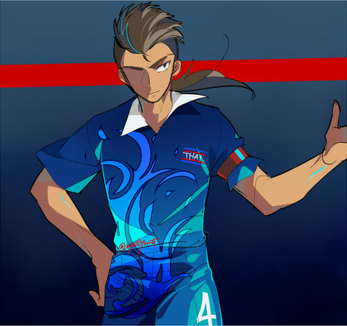 2018/08/05 Category : 絵 青ユニ W杯中のたたドリイベントで、大会ユニを着た選手が結構いたんだけどタイ代表はブルーだったので最高という感じで描いてみました公式ユニっぽいの描くと訴えられたりしないかなと心配でやめましたちなかつてのゲームでも紺色メインのユニを着てたタイユースいてそちらもスタイリッシュで素晴らしい 全身図見てみたいタグ:キャプテン翼 ブンナーク