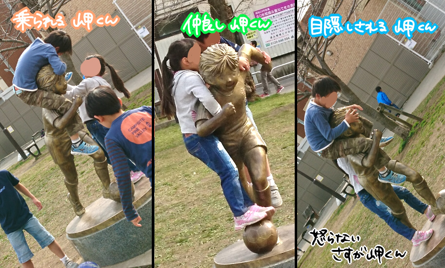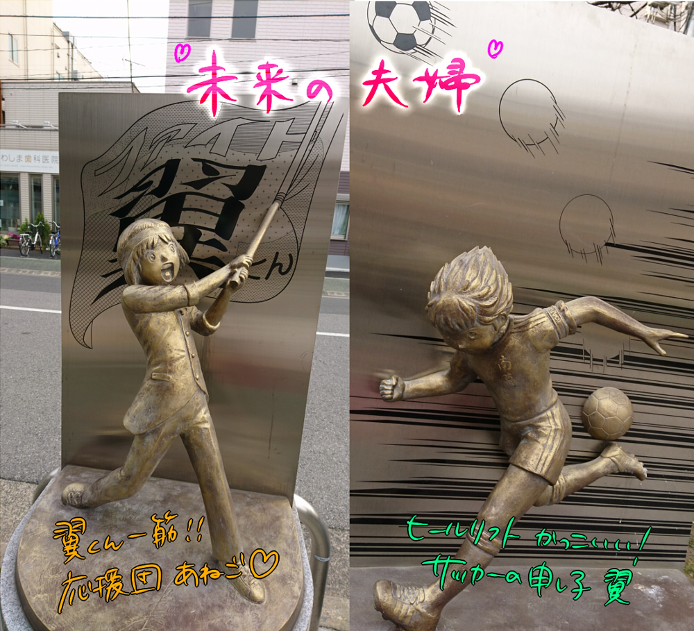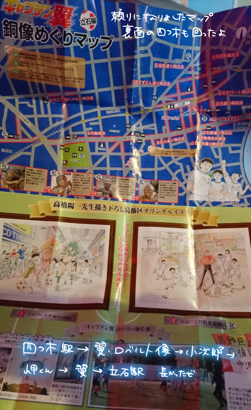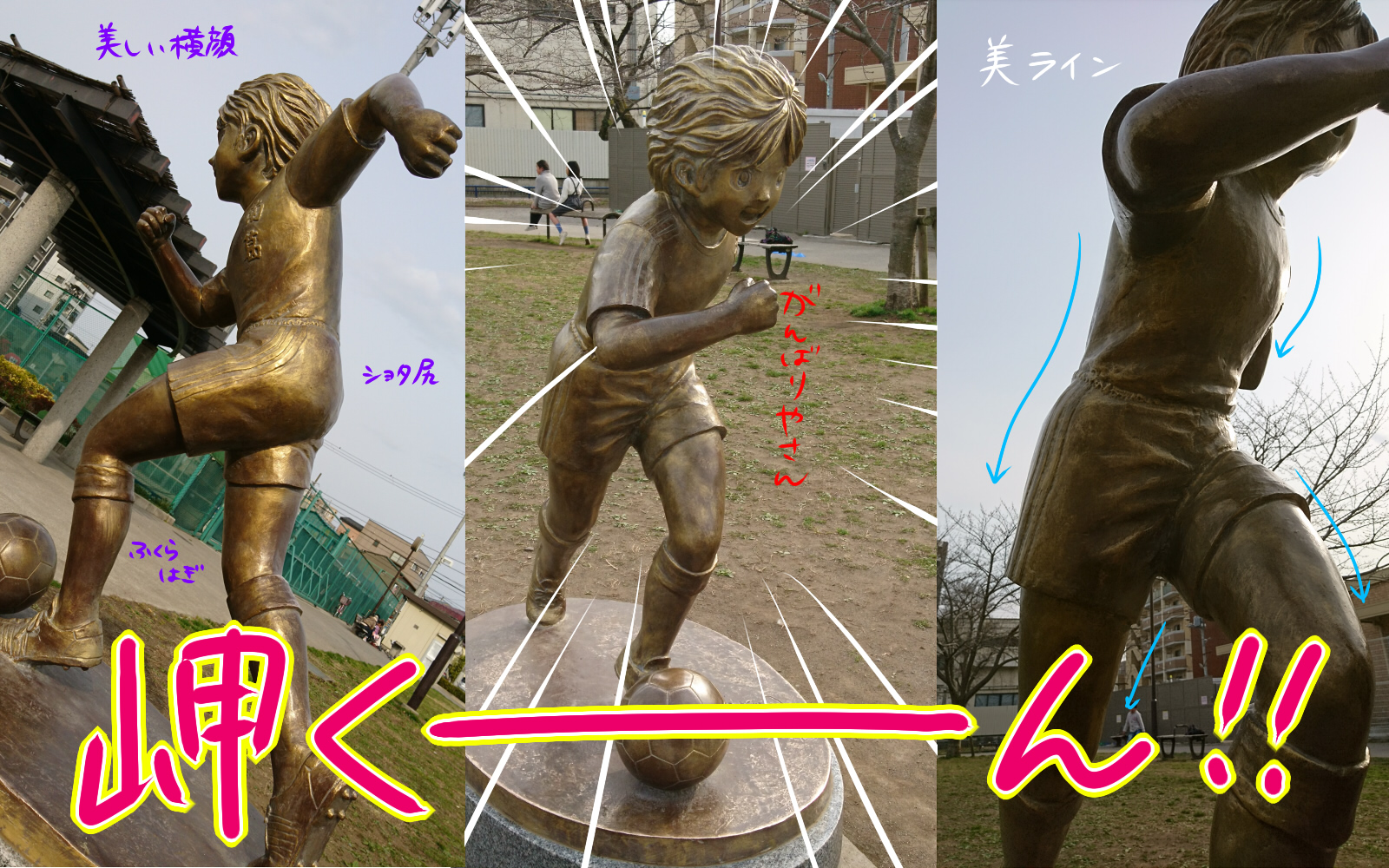 2017/03/24 Category : 絵 翼聖地巡礼 世界最高峰の新田狂と名高いふぉろわー様(むに先輩)と、キャプ翼の聖地巡礼的なあれをしてきましたまずは新田神社 破魔矢発祥の神社らしいです絵馬を描けるとの事で、あえて縁結びの絵馬を買って自由に描きました願い事はナイショ 豚らしく恥ずかしいことを描きましたそのあと四ツ木に行って、生きてるうちにやりたいなーと思っていた翼たちの銅像巡りをやってきた地図は駅前に置いてあったのでありがたい気持ちで頂戴しました散々迷子になったりあっちだこっちだとほっつき歩いて、最初に見つけたのが翼とロベルト(幼い翼の才能を見出した恩師)翼の手がいやらしいところにあるねーって話をしたちょっとお腹が空いたのでブレイクタイム商店街の一角にある、懐かしい雰囲気(絶対昭和からあるような)喫茶店で昔ながらのケーキやパンを買えたり、トーストが食べられたりしますちなみにナス美さんと1月にC翼カップ行ったときに買ったおいしすぎてシュートするというサブレも売ってましたいただいた紅茶もおいしくて、それで650円とかだから安すぎる上の地図をおおっぴらにしてたら、別バージョンの地図ありますよーって店員さんがくださった 宝物にします街並みはこんな感じ 昔からある商店街って感じで、街灯にボール、垂れ幕に翼と岬くんの春画をあしらっていて、銅像巡りの観光客に優しく、銅像こっち→とかいうシールも随所に貼ってあったすごくいいところでした ちなみに四ツ木の近く・立川も翼の街だった翼、儲かってんな・・・早苗ちゃんと子供二人ちゃんと養えよな・・・未来の夫婦 原作では早苗ちゃんが翼に惚れて、最初は男子モノの応援団ウェア着て大会とかに来て応援してくれてたけど、中学に入ってからは女らしくなって、恋敵が増えて、翼は海外に行っちゃう・・・とかいう前途多難な恋愛模様だったけど結局結ばれて良かったね・・・商店街を抜けて住宅街を行くと公園が見えて、こじこじどこ・・・?と思ったらまさかの公園のど真ん中に君臨 さっすが日本の猛虎・日向小次郎!ちなみに周りでは小学生くらいの男女が当たり前のようにサッカーやってて、これもキャプ翼の影響なの・・・?と思ってちょっと怖かった数百年ぶりに公園のブランコで遊び、こじこじの写真撮影会を行い、子供たちから不審人物的扱いを受けながら、次の銅像へこのあと上の早苗ちゃんに出会いました ちょっと迷った・・・そして公園とテニスコートの複合施設みたいなところに、彼はいたのであるこの岬くんは小学生時代の1/1スケールでお送りしているらしい実際の岬くんこんな感じかー!っはー!可愛いなあー!意外とおっきいなあー!みたいなクソ残念な感じで写真を50枚くらい撮り、三次元のショタやロリのおもちゃにされても怒って動きださないあたりさっすが岬くんだ・・・って感動した ちなみに顔はけっこう鬼気迫ってる感ありそんな感じで銅像巡りを一通りやり(若林くんは遠くて無理だった…ごめんよ…)(石崎はスルーした すまん)松山くん意識で富良野の肉食べよう!(リベンジ)というわけで予約して頂いた焼肉屋さんへ、1時間歩きまくって(わたしのせい)到着おいしかった!!!!!!!基本まずくないものなら何食べてもおいしいっていうchだからこういうの食べさせるの本当にもったいないんですが、お値段するだけあってスーパーの肉とは違うなってのはなんとなくわかった酒を浴びるように飲みながら、豚話が開花宣言したら止まらなくなり新田がね・・・ブンブンちゃんがね・・・わかる・・・好き・・・とか幼児みたいな語彙力でひたすら話していた正直言ってもっと話したかった むに先輩の彼との話をもっともっと聞きたかった次回あった時には根掘り葉掘り聞かせてもらおうそんな感じの聖地巡礼でした!推しの話は良いね来週サッカー日本VSタイやるから、どっち応援しようかすごく楽しみむに先輩には感謝してもしきれない・・・彼と幸せになれ・・・タグ:キャプテン翼 おでかけ