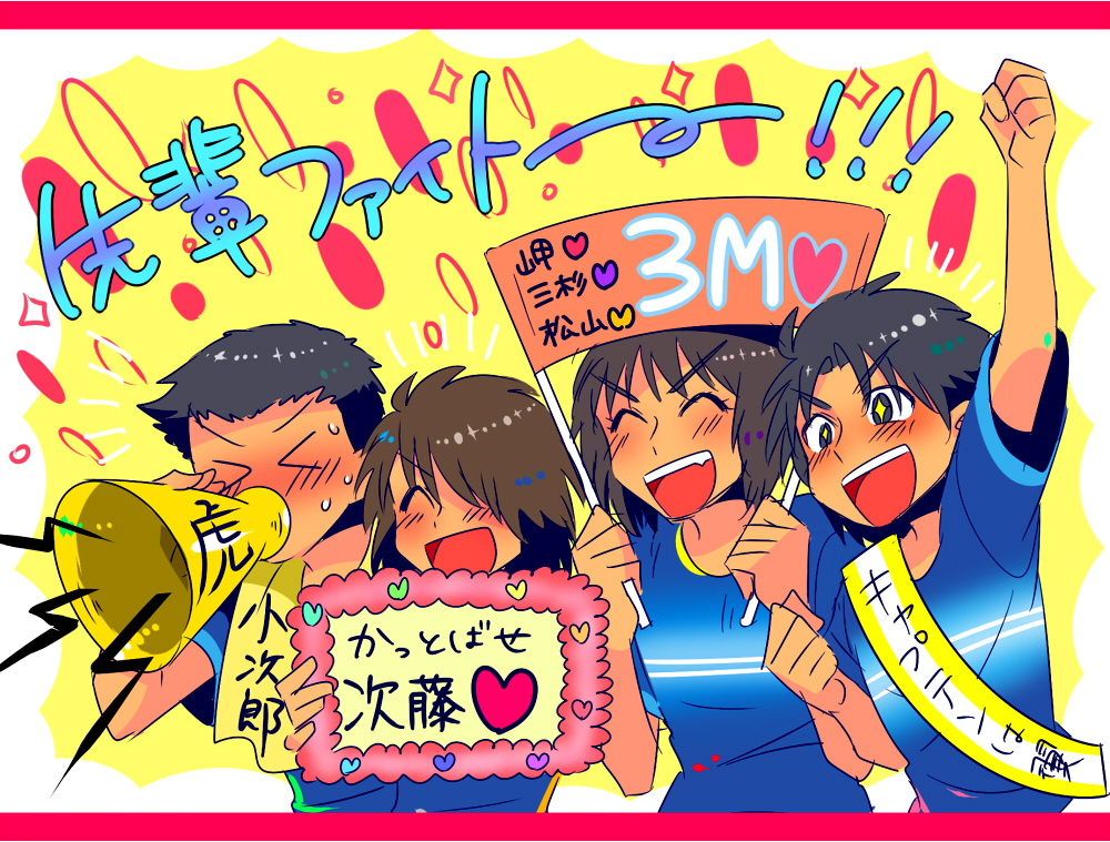 2017/03/05 Category : 絵 応援 ついったーでリクエストボックスを設置したところ、思っていたより多くのリクエストを頂戴し、その中の一つで「はしゃいでるキャプ翼日本代表後輩組」を描かせていただきました葵は翼崇拝だし、佐野は次藤専だし、タケシは小次郎とコンビだし、新田君…?新田君は誰推しなんだ…と小一時間考えた末無難なところを応援しそうな世渡り上手さがありそうだなと思って3M旗を持たせてみました佐野のかっ飛ばせ次藤のピンクの枠が大腸っぽいなって描きながら思った後輩組はみんなわちゃわちゃが似合う可愛い子ばっかりタグ:キャプテン翼
